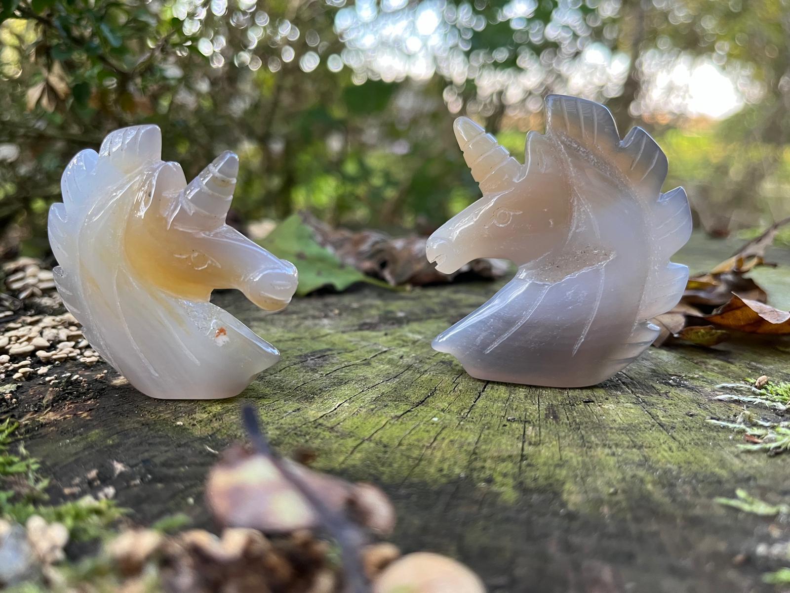 Een agaat in de vorm van een eenhoorn. De stenen zijn tussen de 5 en 6cm hoog.