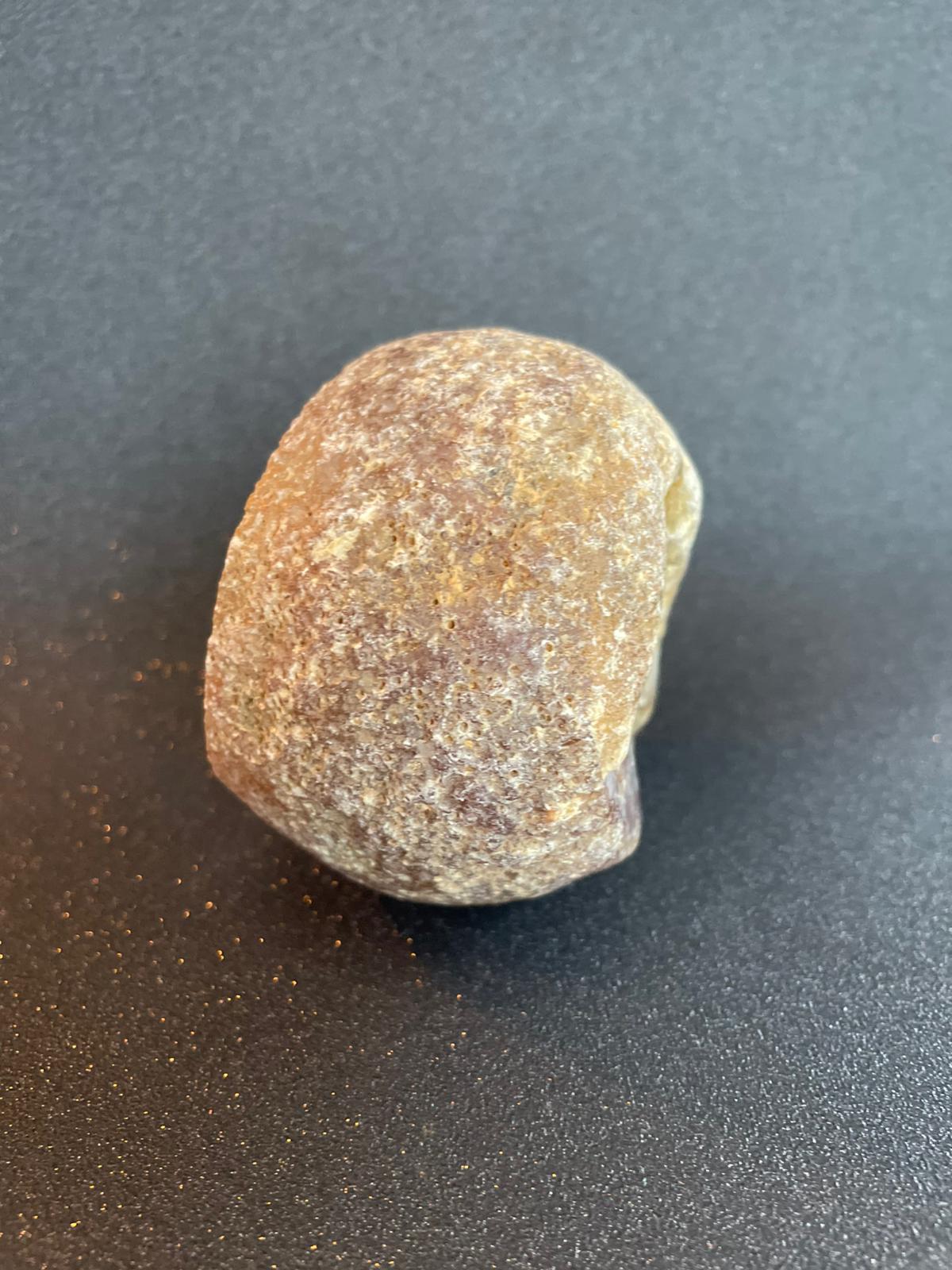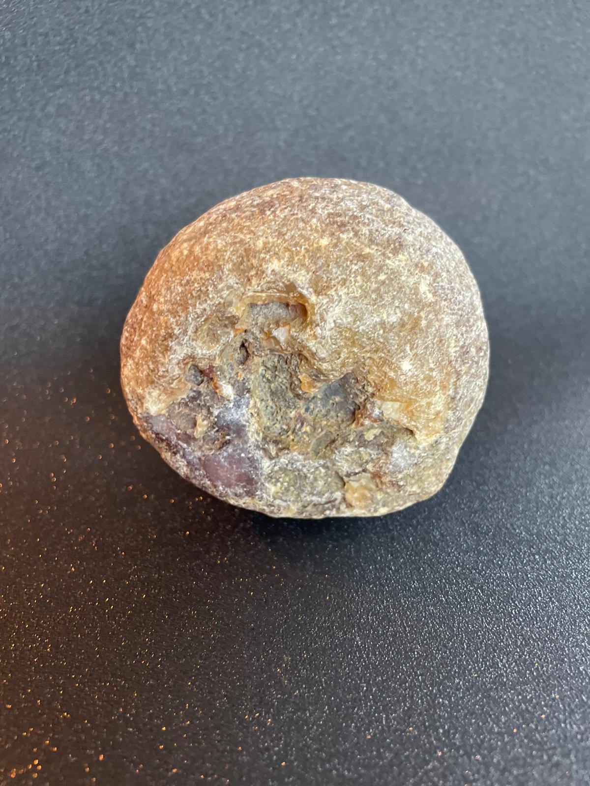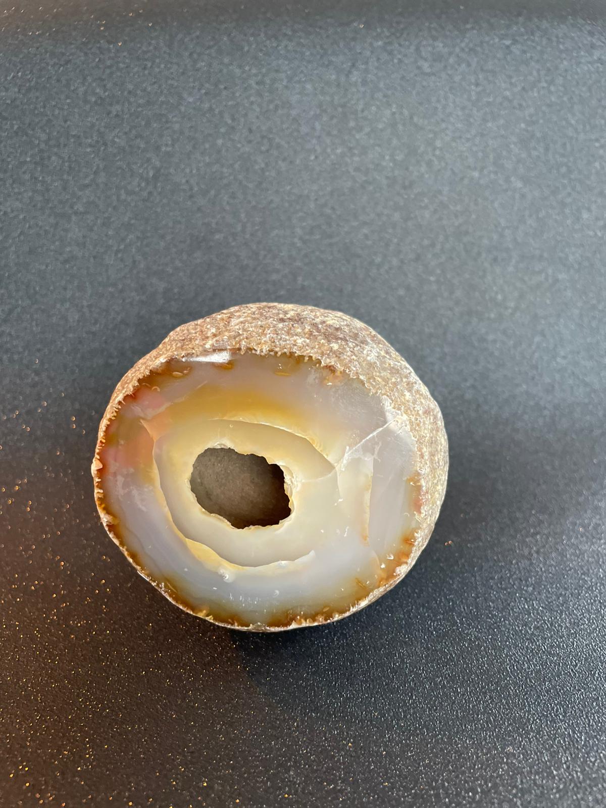 Een bruine agaatgrot. De agaat is 8,8cm in doorsnede, 8cm hoog en 5,3cm diep. De agaat weegt 579 gram.