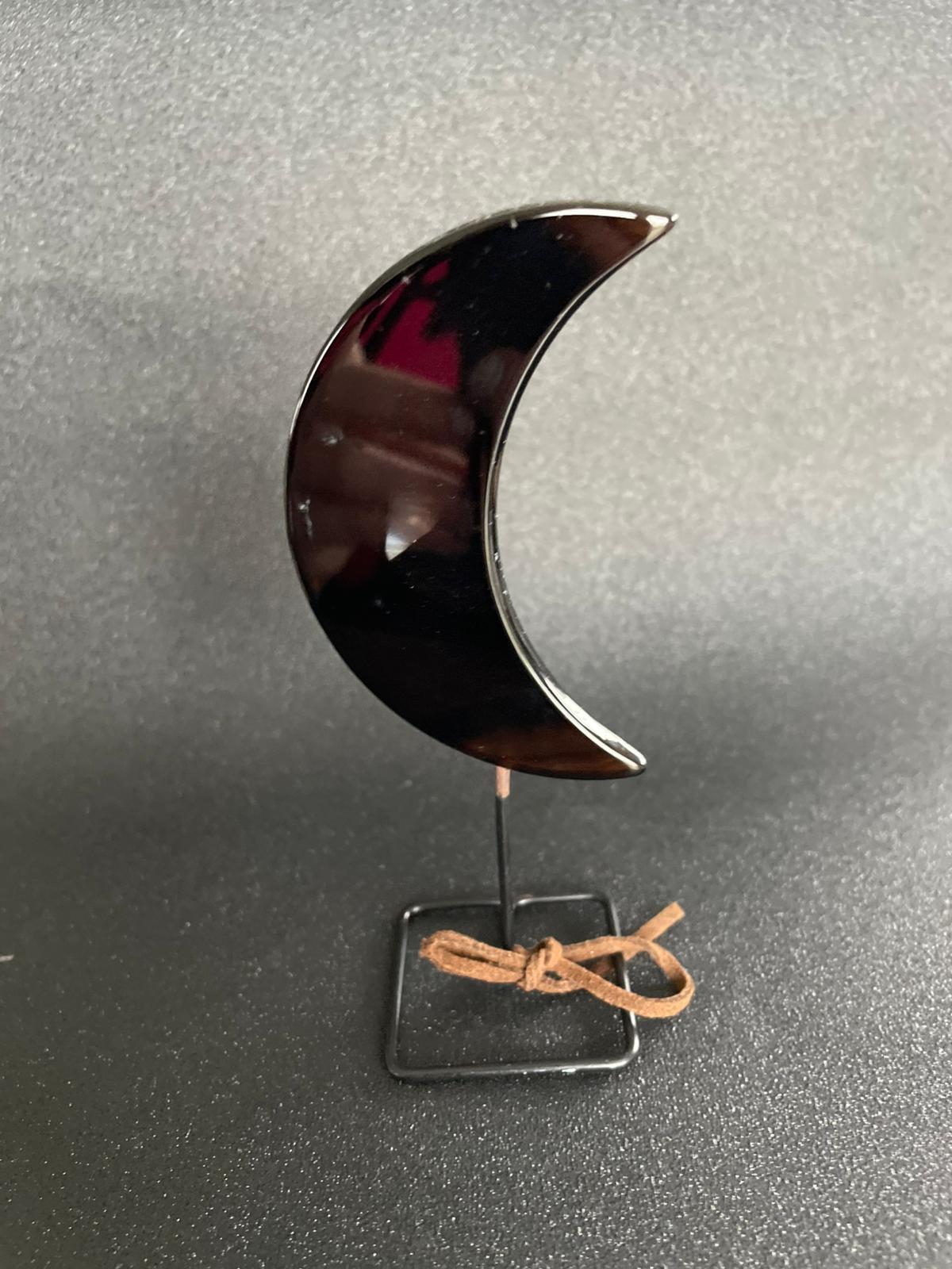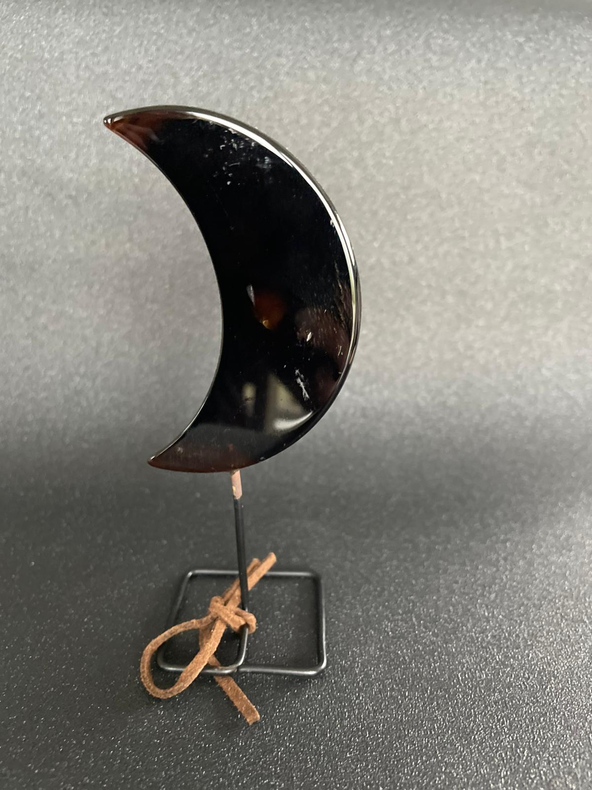 Een agaatschijf in de vorm van een maan op een standaard. Het geheel is 12cm hoog en weegt 33 gram.