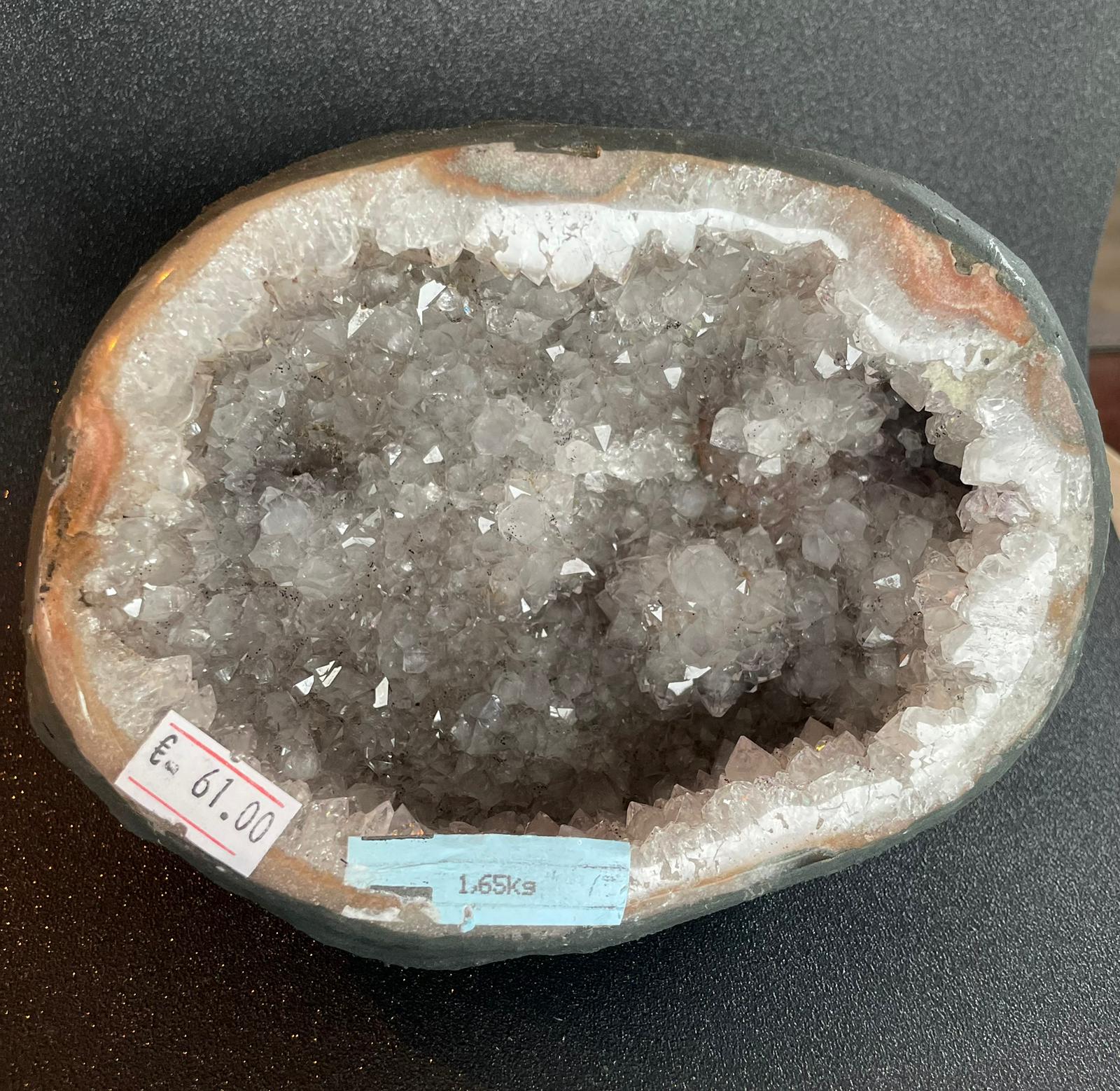 Een amethist grot van 1,65kg. De steen is 17 cm breed, 14cm hoog en 11cm diep.