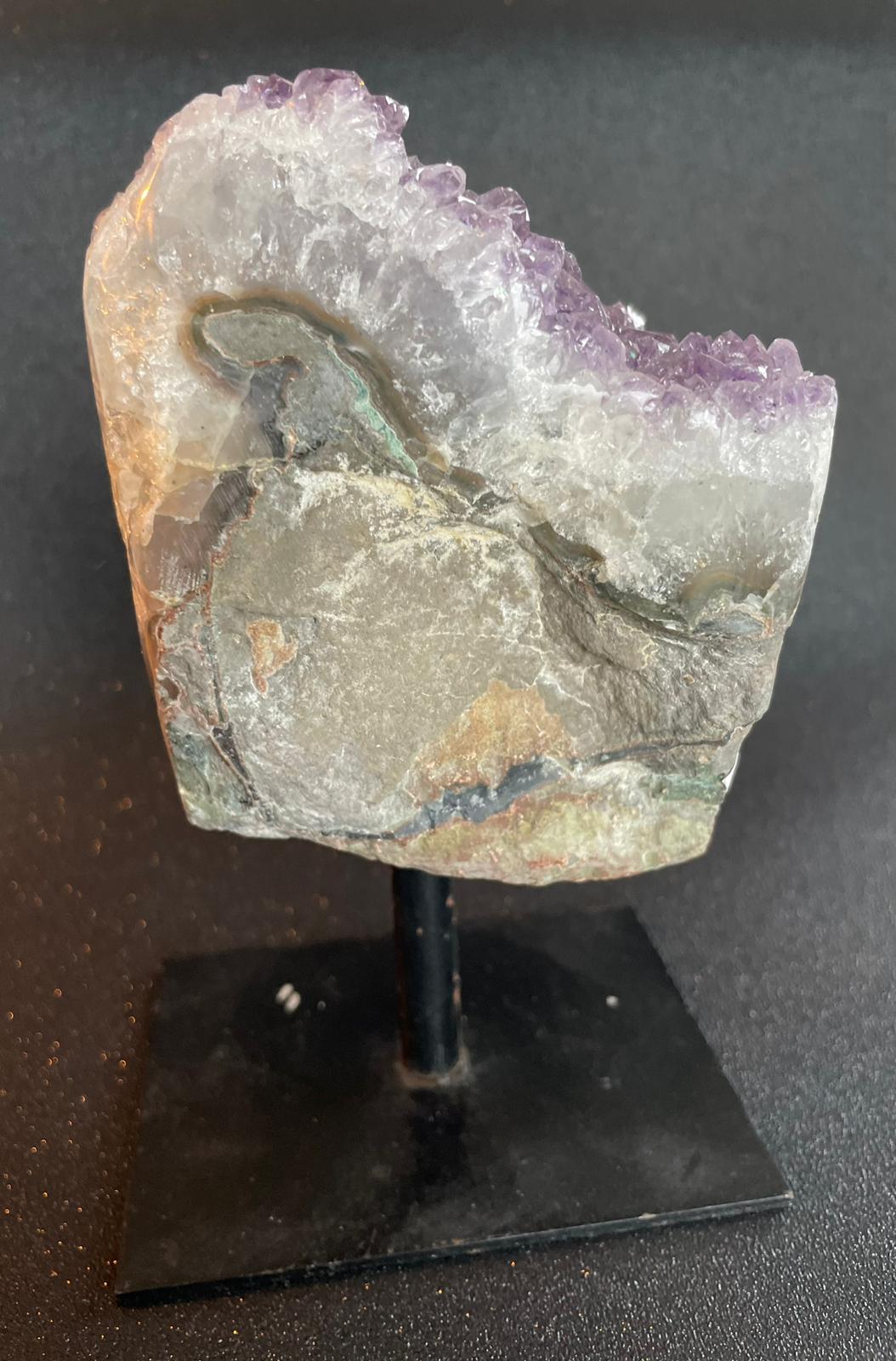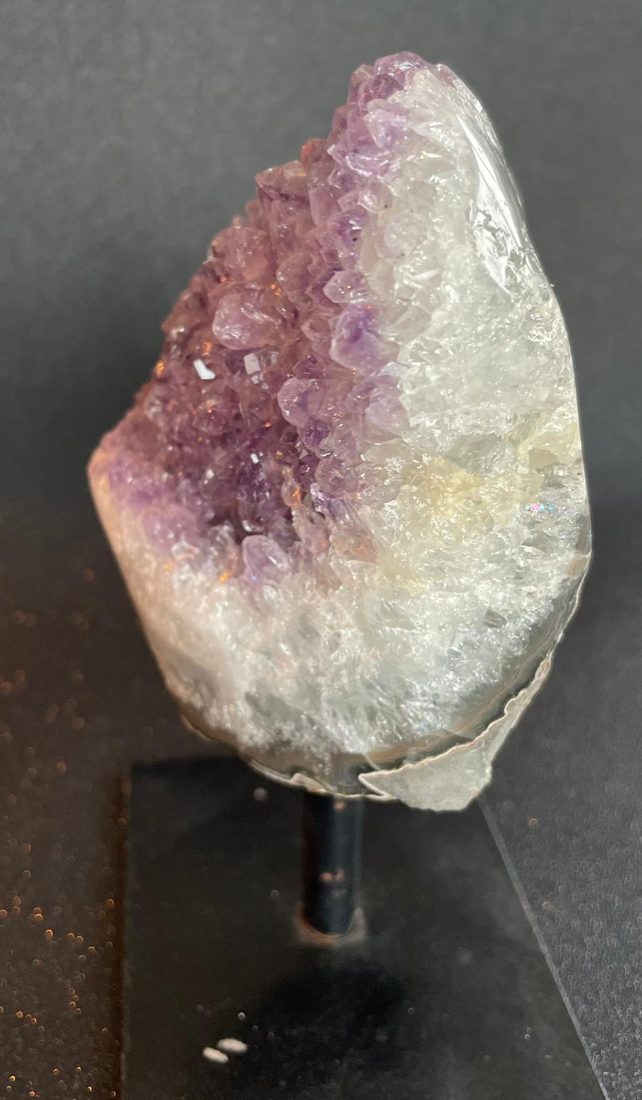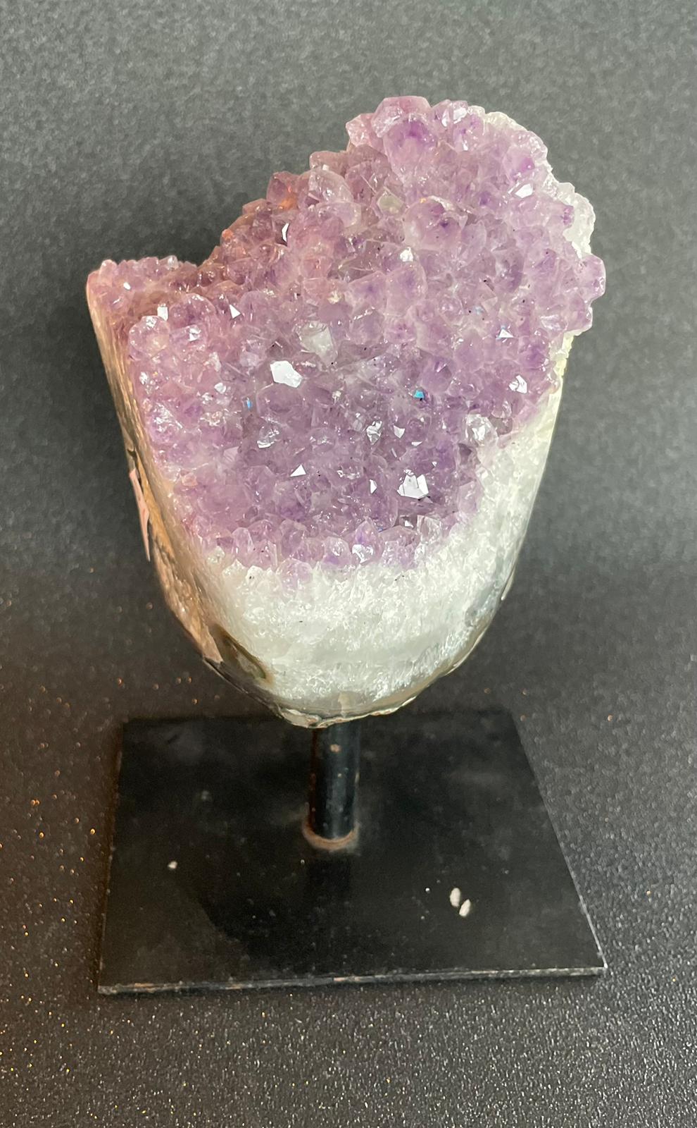Een amethist op een standaard. Het geheel is 15cm hoog en weegt 720gram.