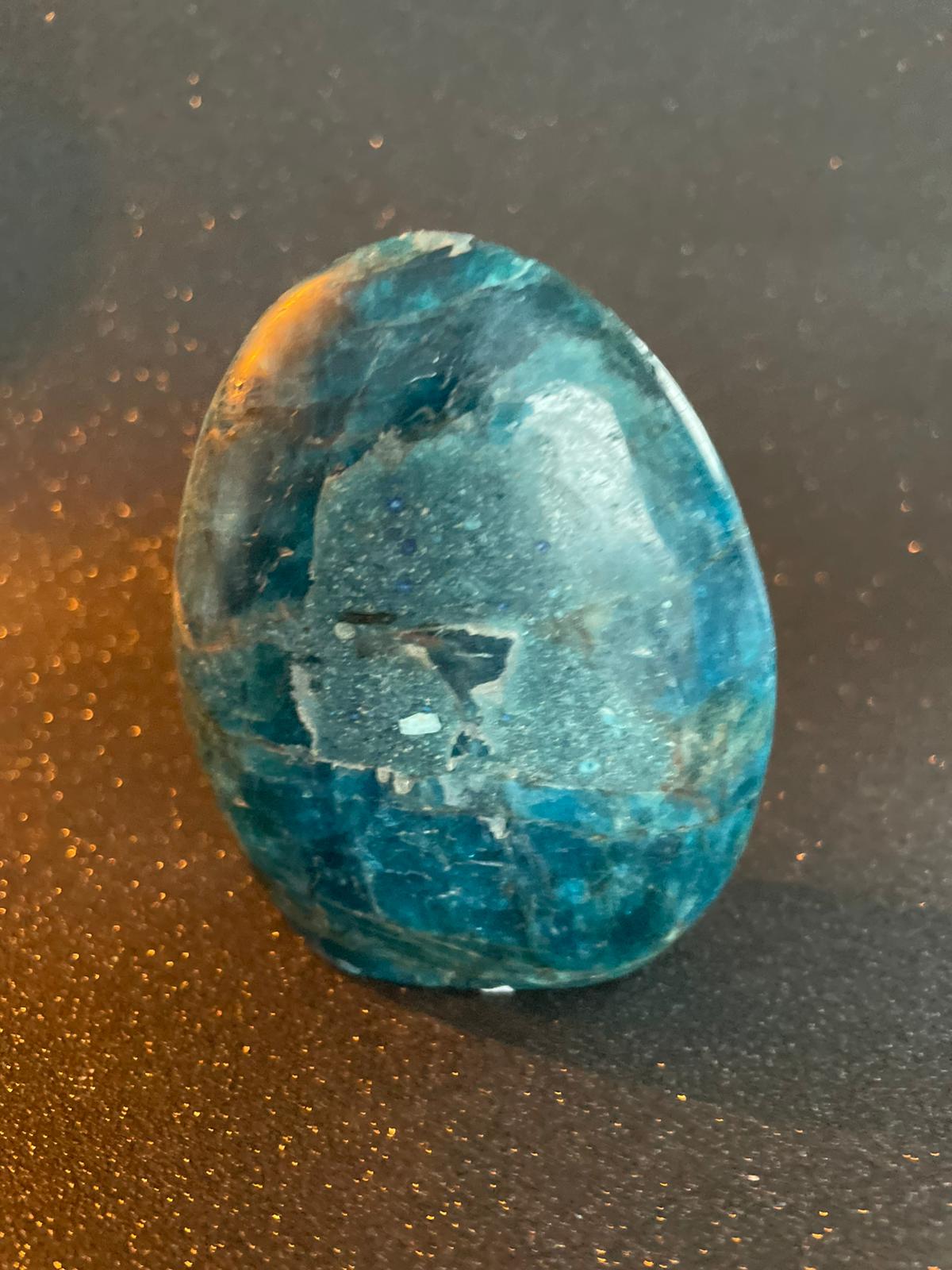 Een staande apatiet van 365 gram. De steen is 9 cm hoog.