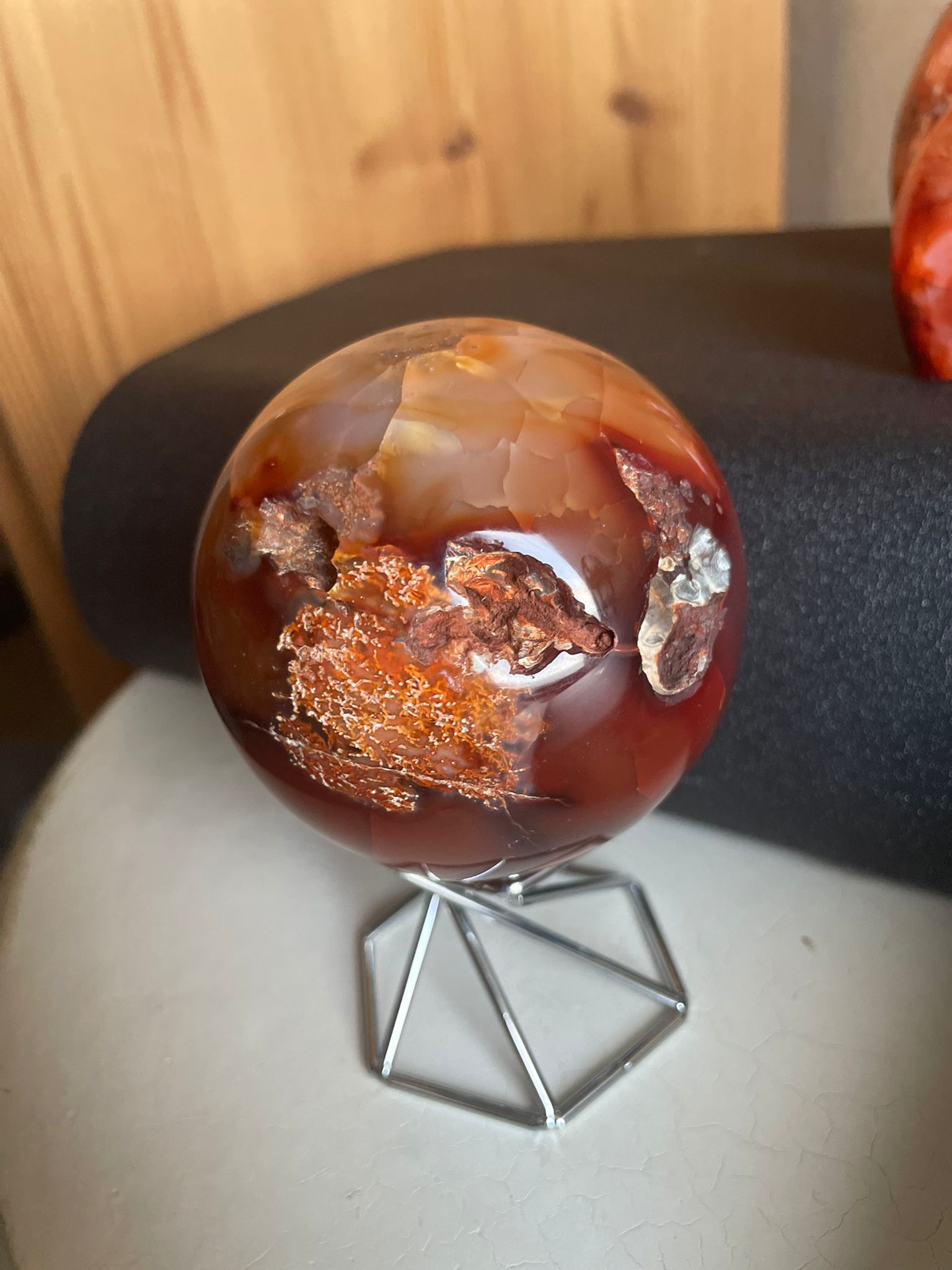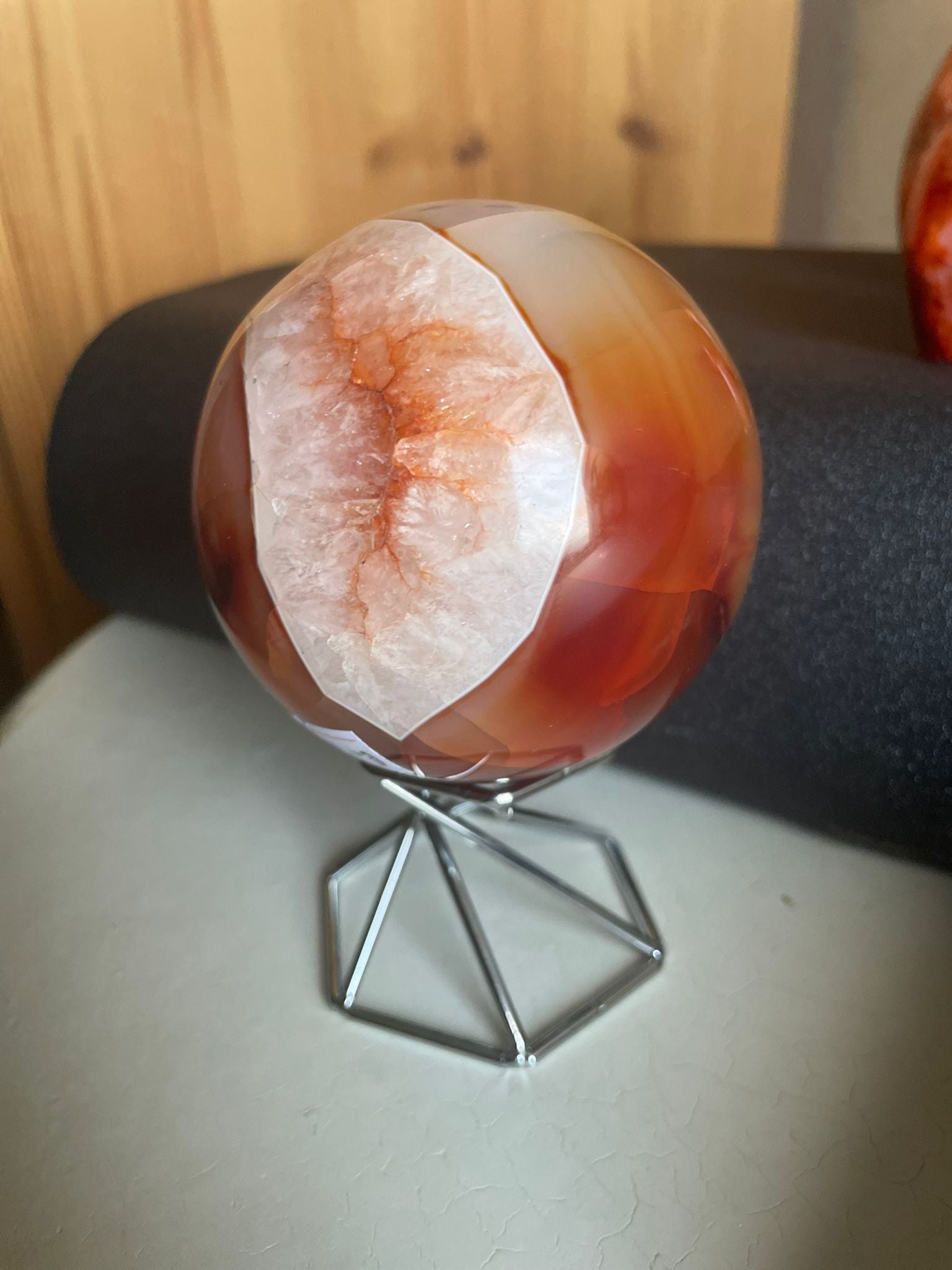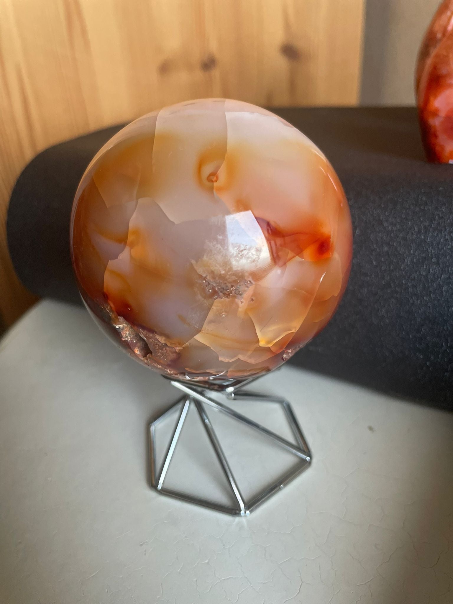 Een carneool in de vorm van een bol. De bol is 7,5cm in doorsnee en weegt 556 gram.