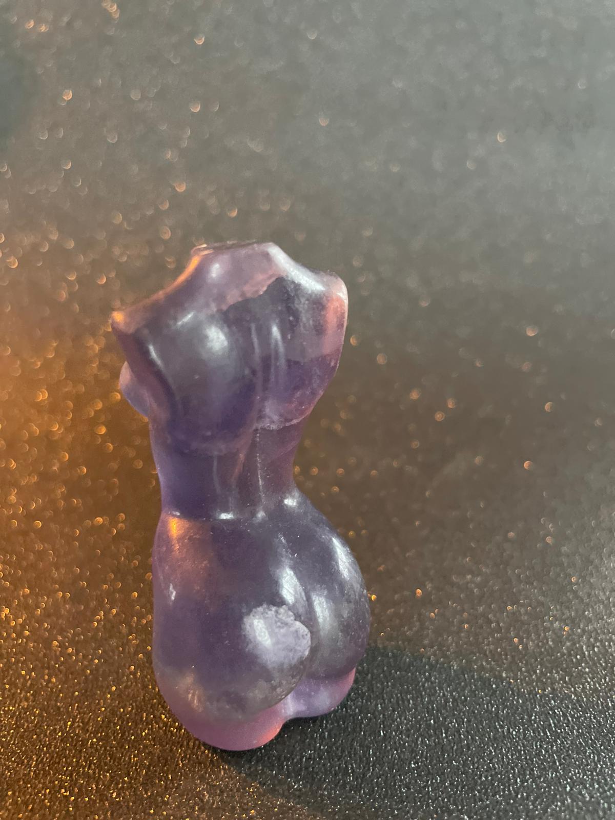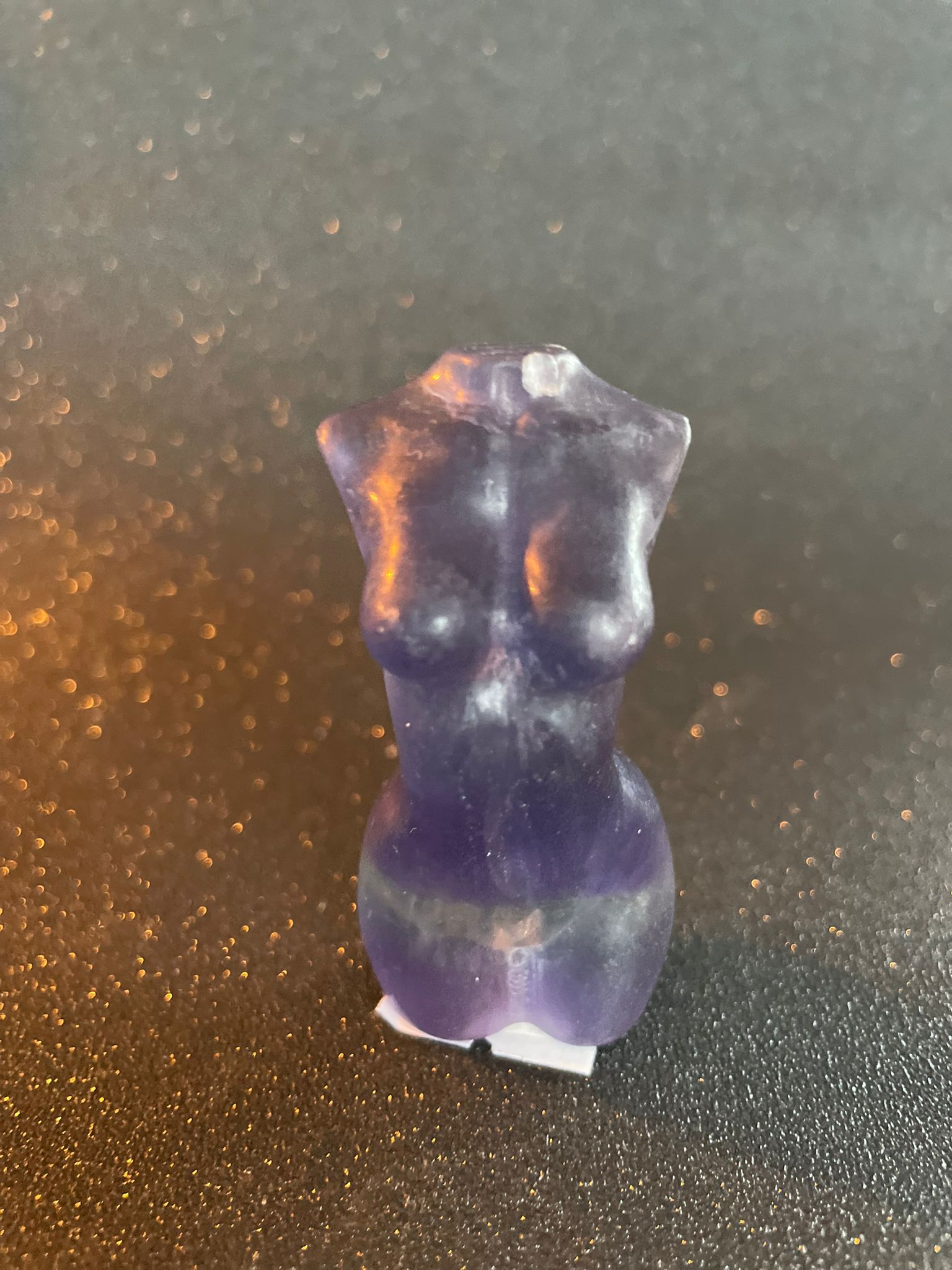 Een fluoriet in de vorm van een body. Het beeld is 6,5cm hoog en weegt 72 gram.