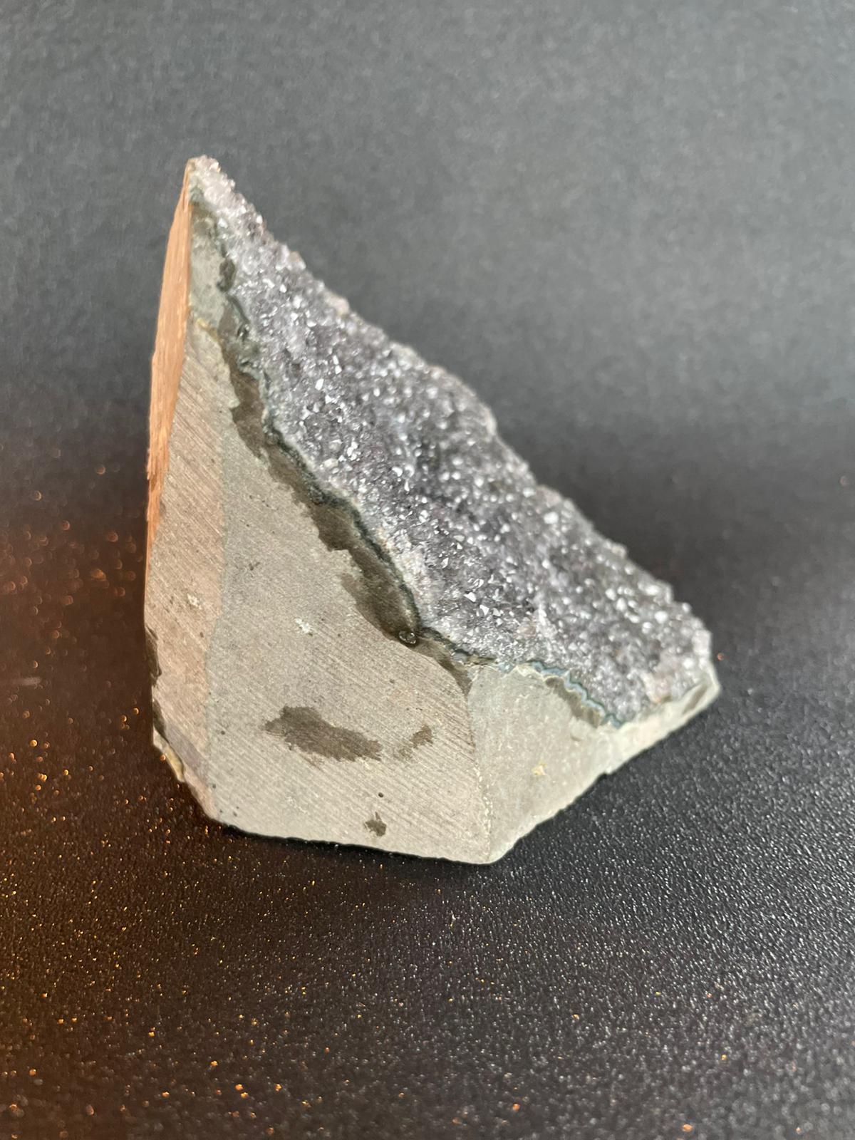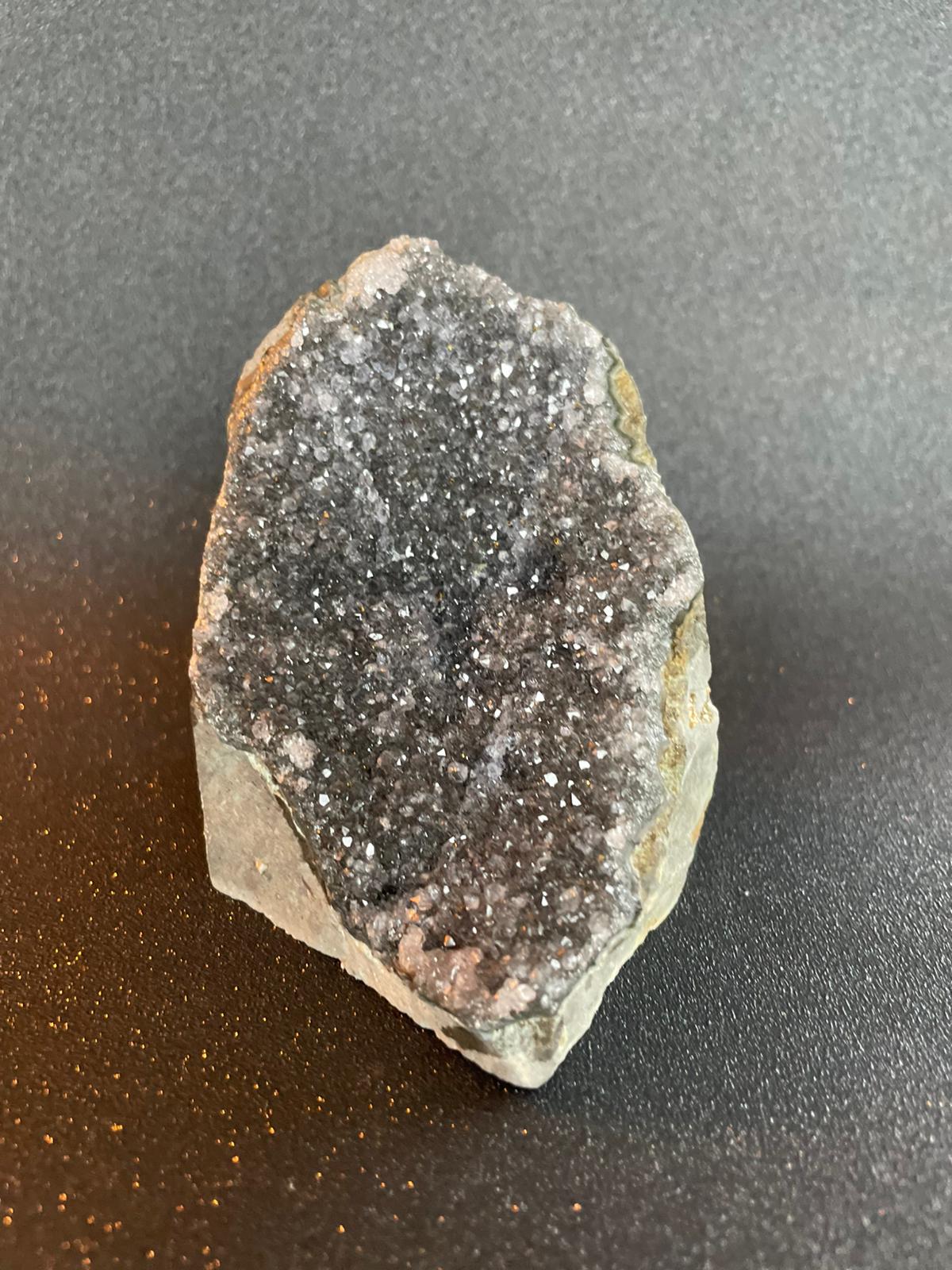 Een galaxy amethist van 493 gram. De steen is 9cm hoog en 9cm diep.