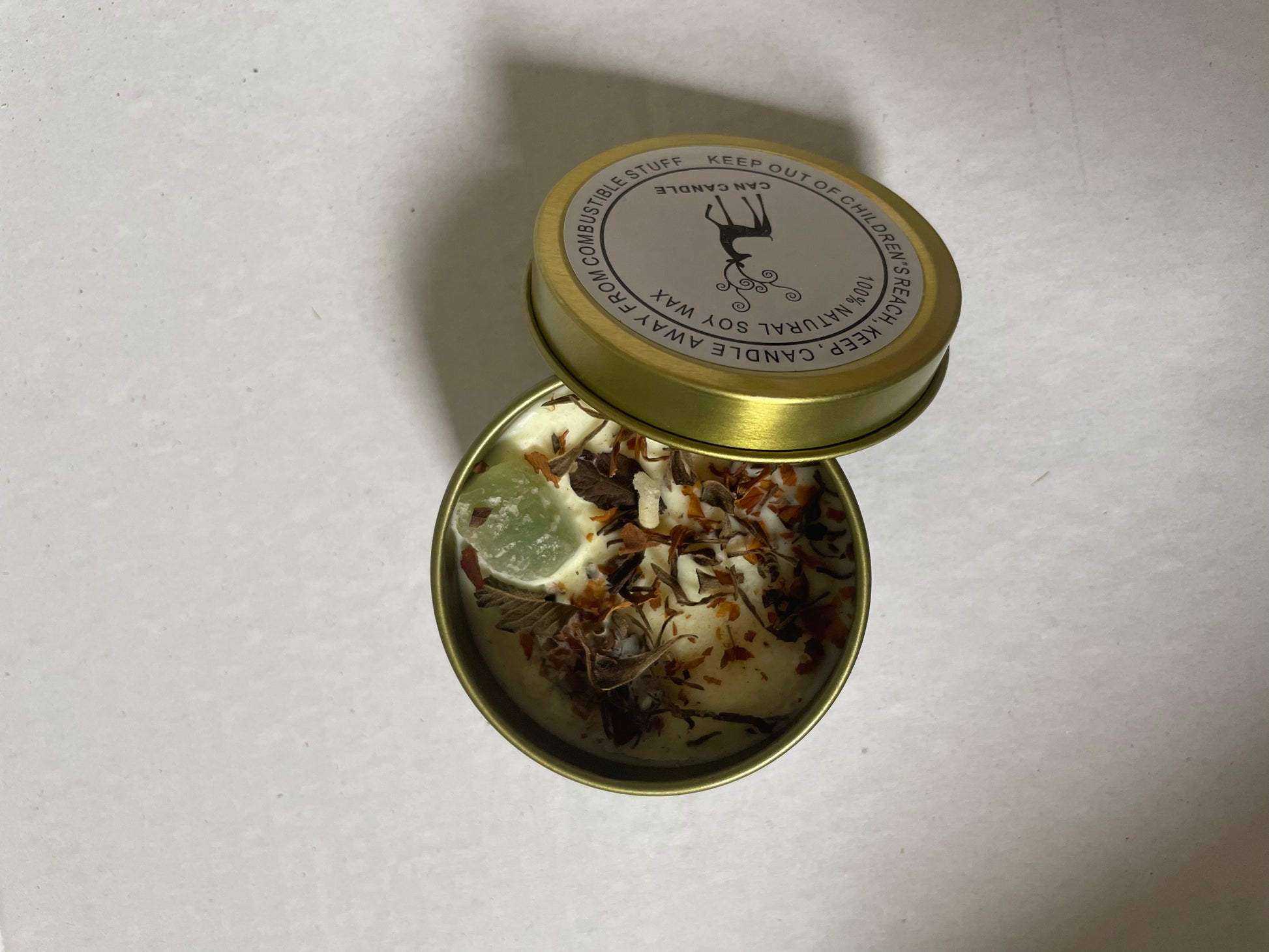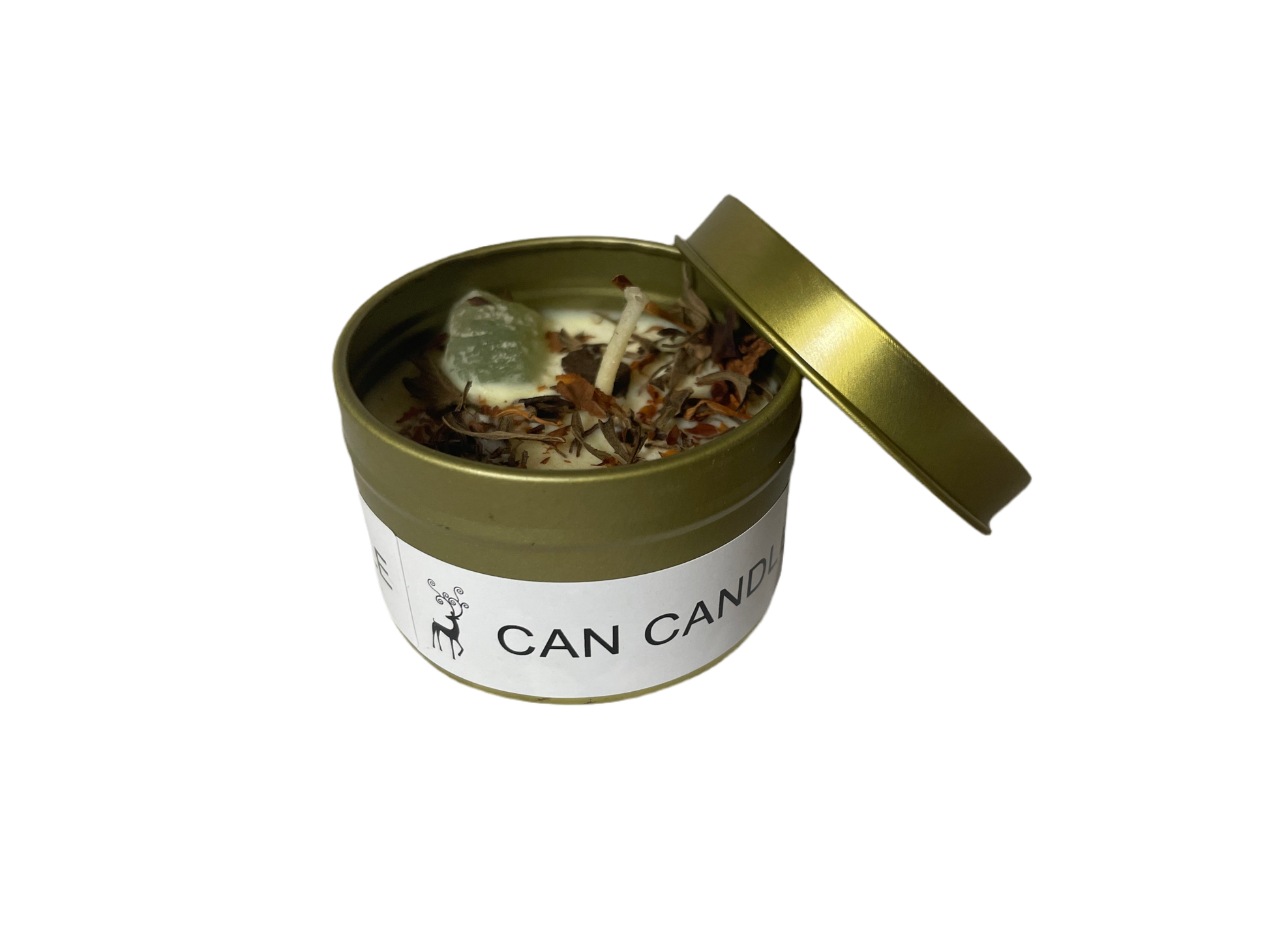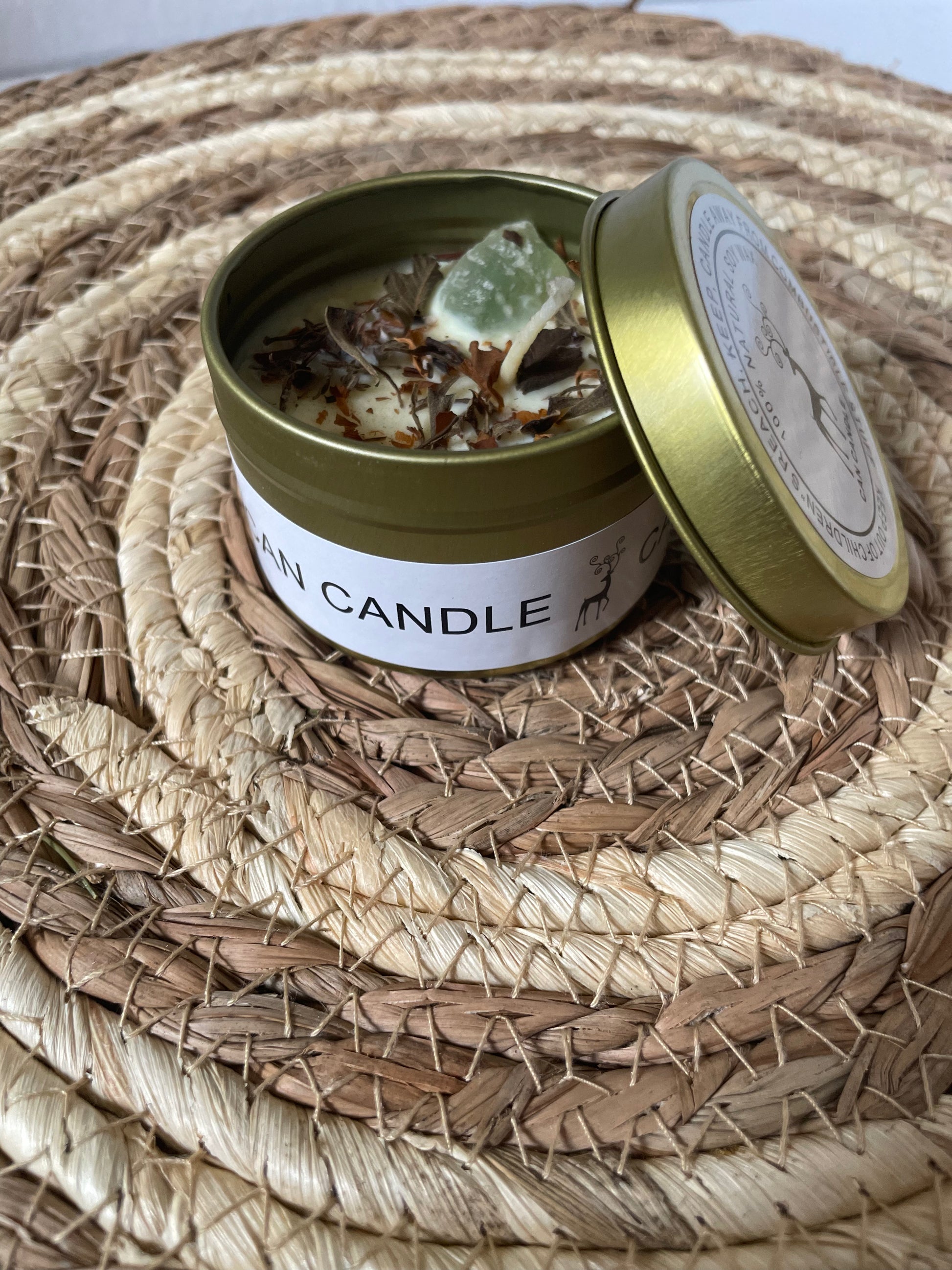 Kaarsje in blik met Aventurijn steentje erin: (Groen)