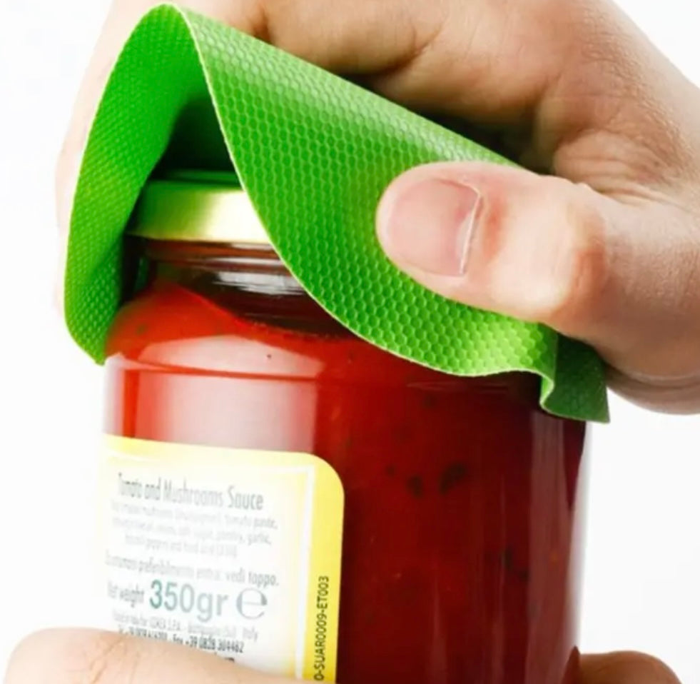 Een handig hulpmiddel om potten en andere spullen mee open te maken. De keukenhulp geeft extra grip, waardoor het gemakkelijker is om deksels van potten af te halen.