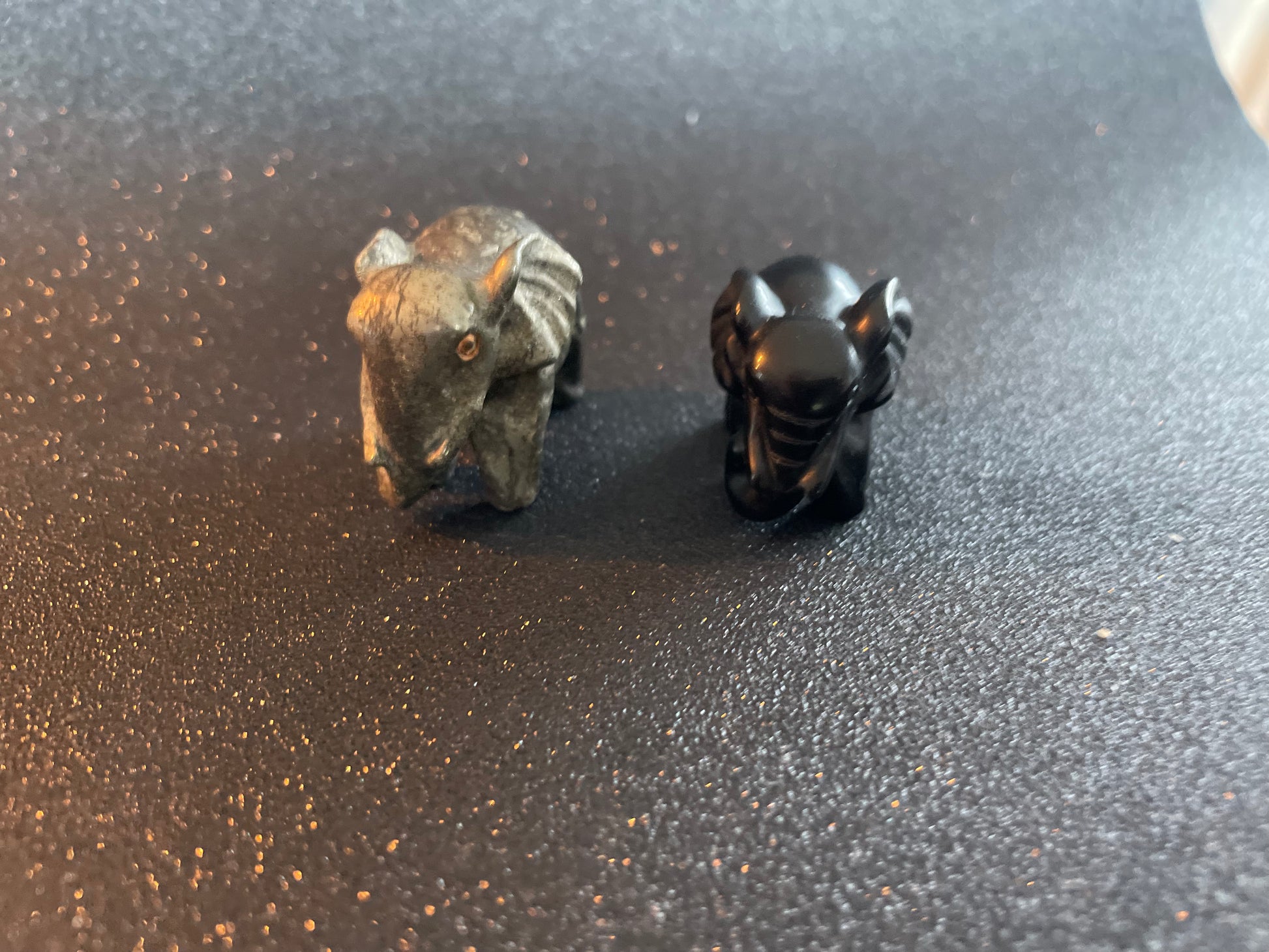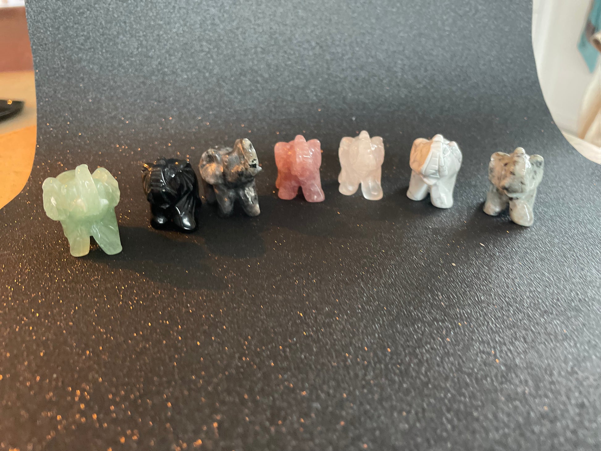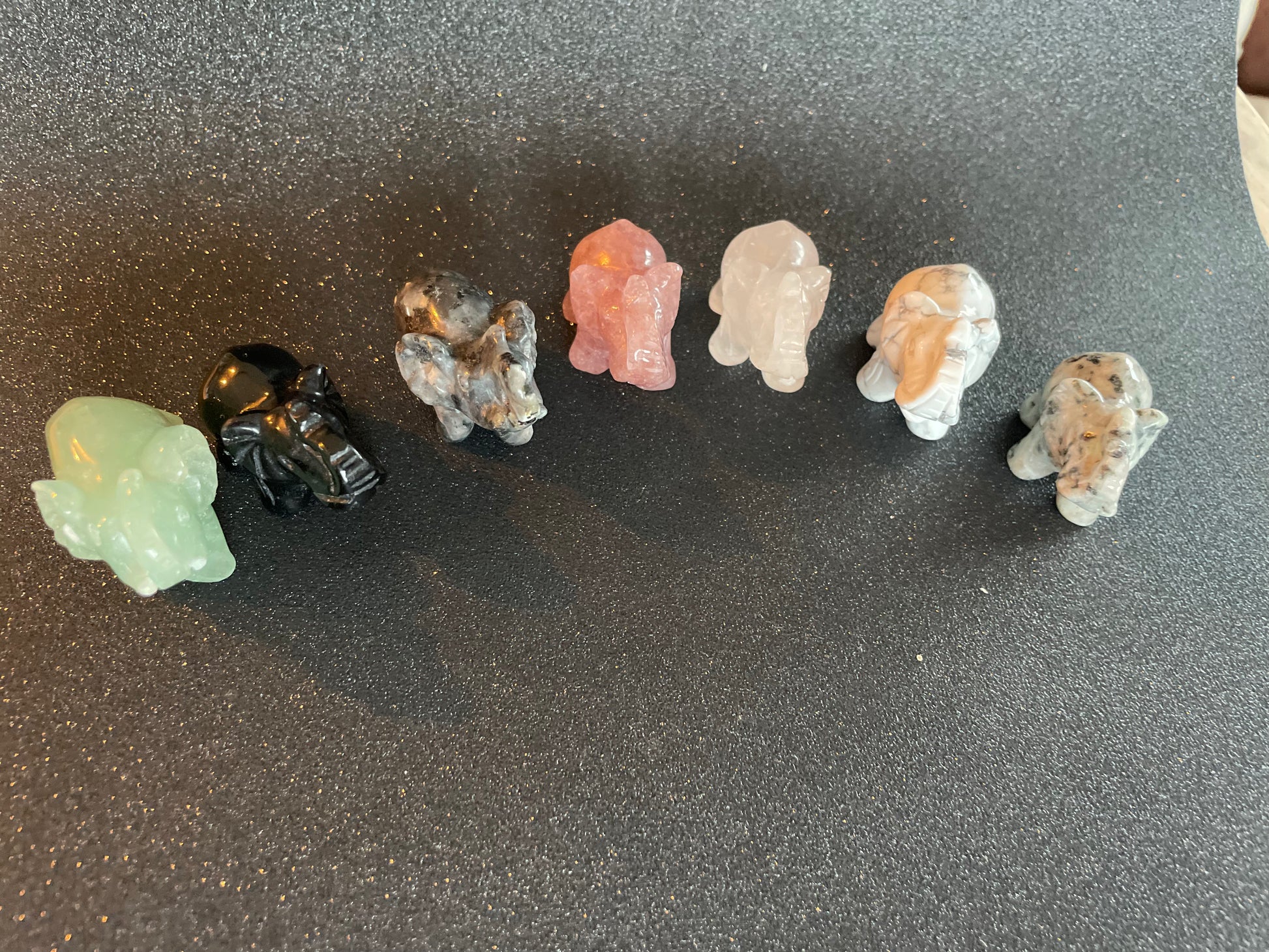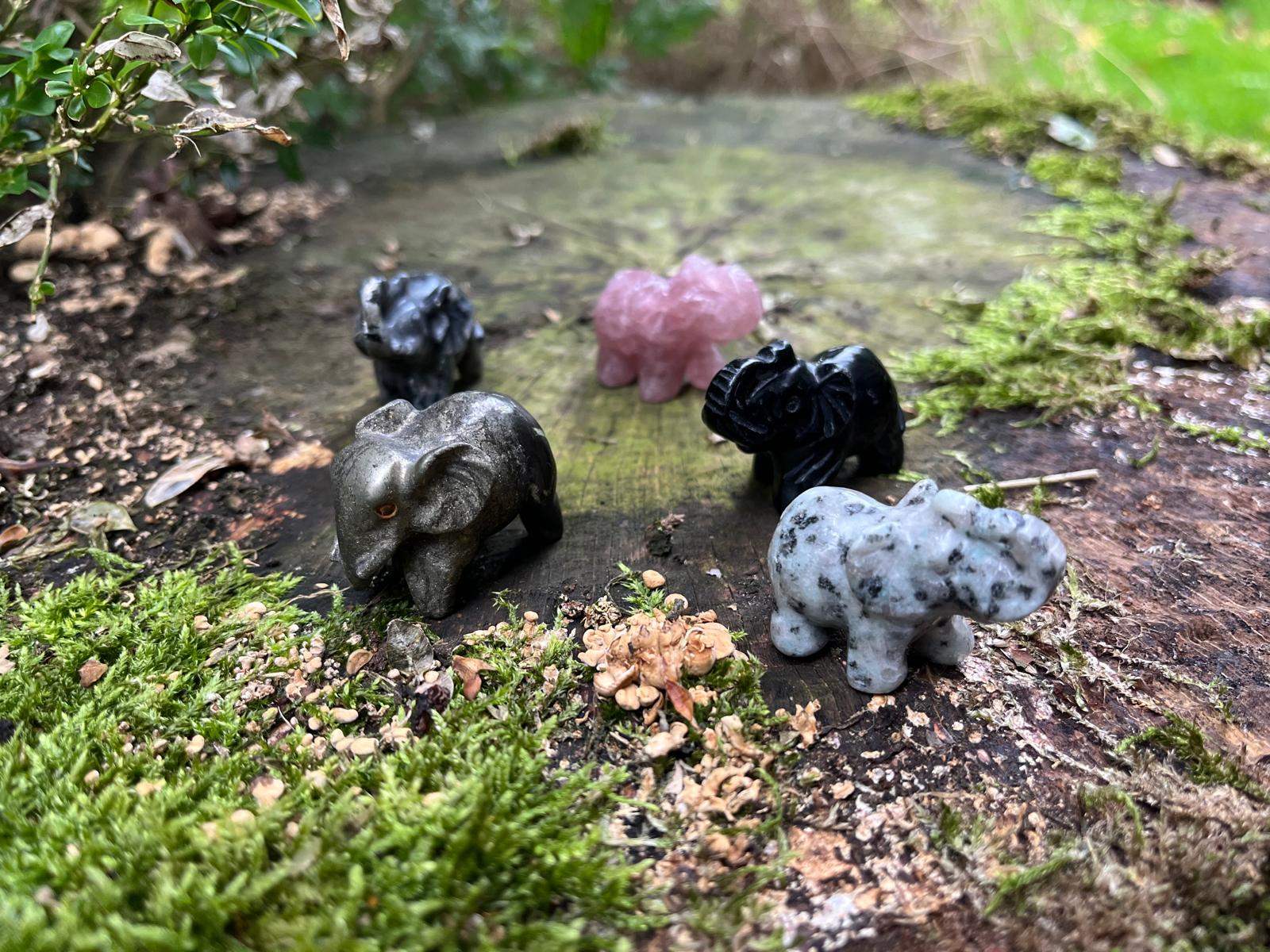 Diverse olifanten carvings. De olifanten staan gesorteerd per steensoort met bijpassende kleur.