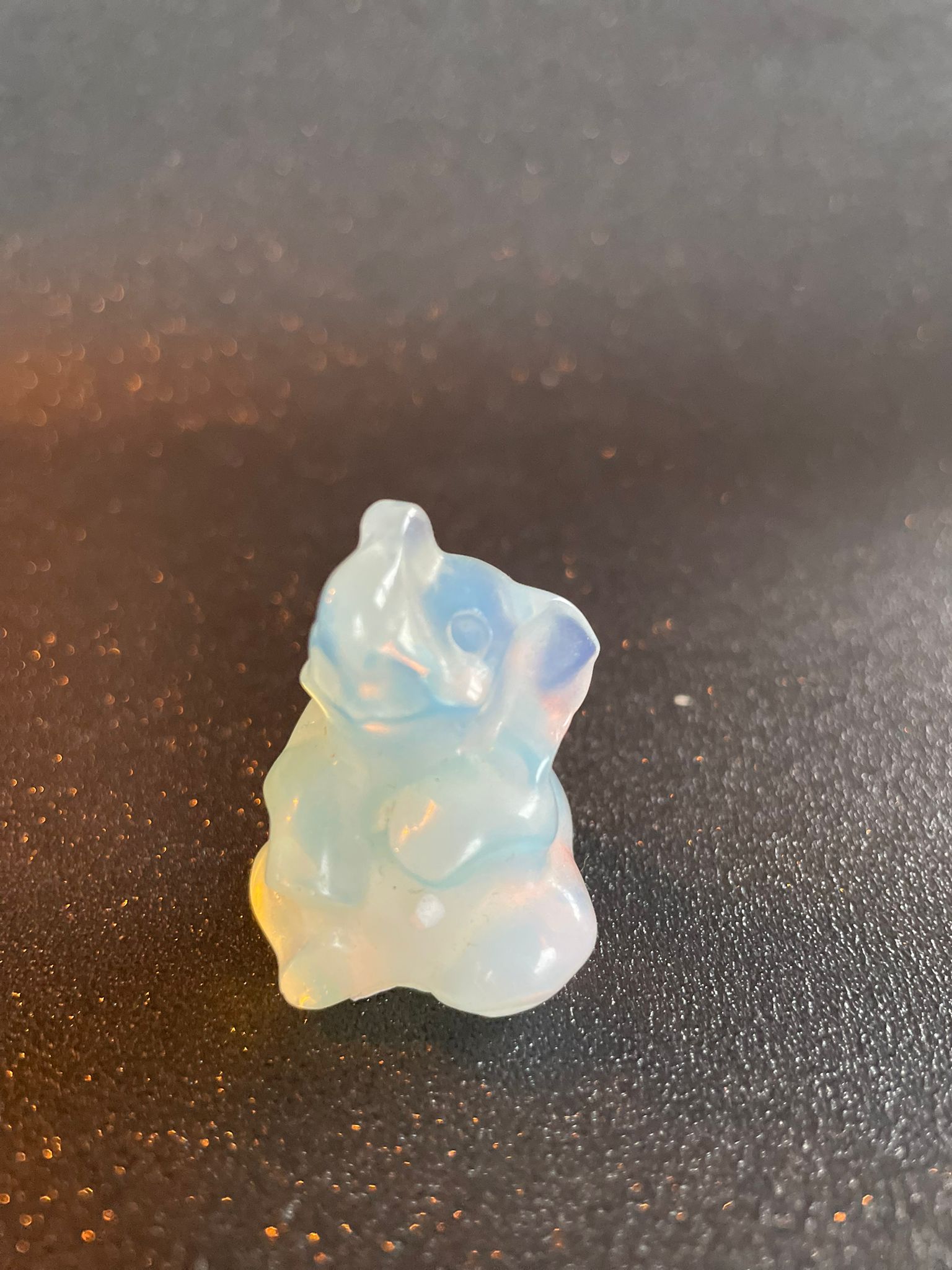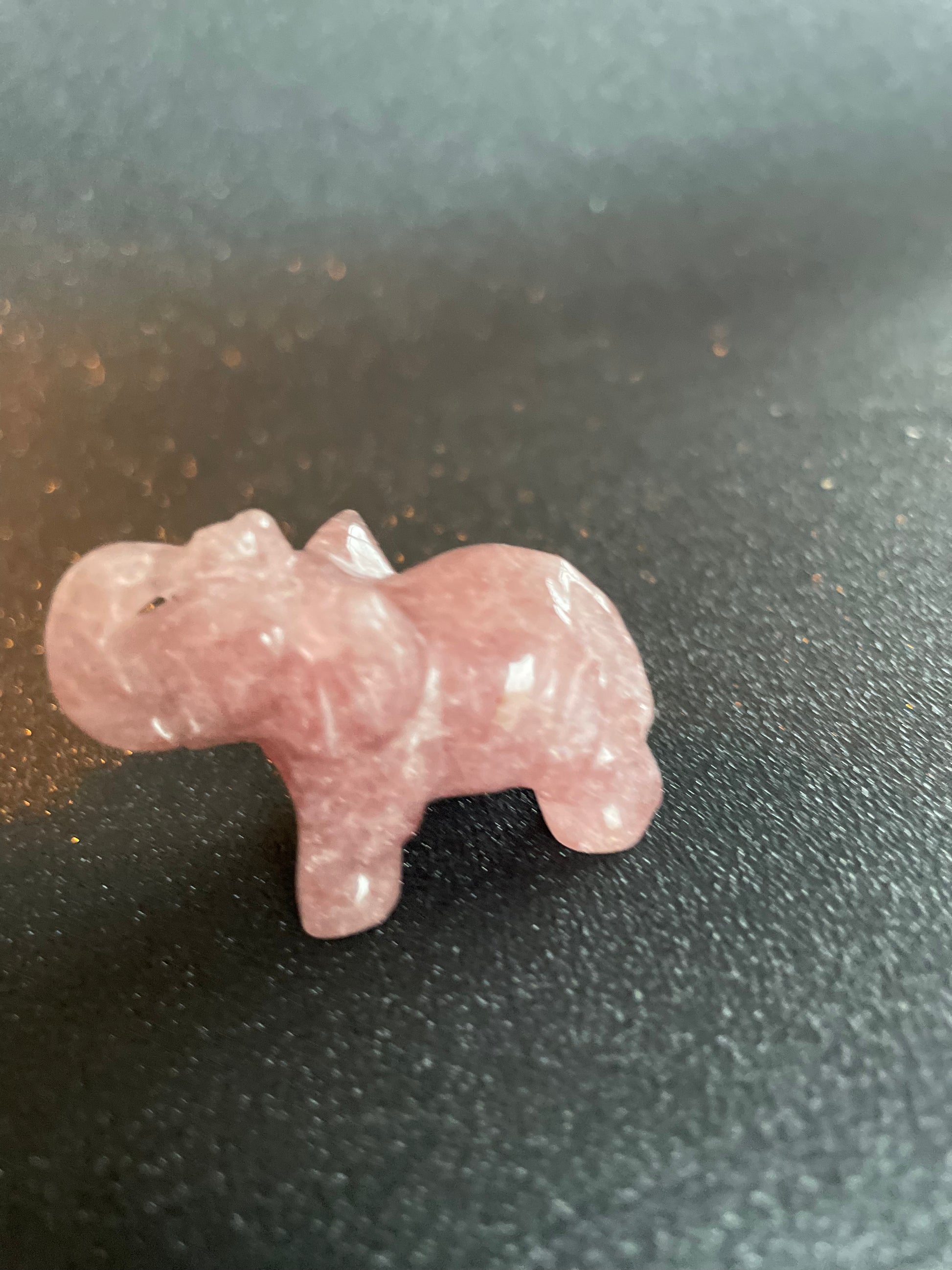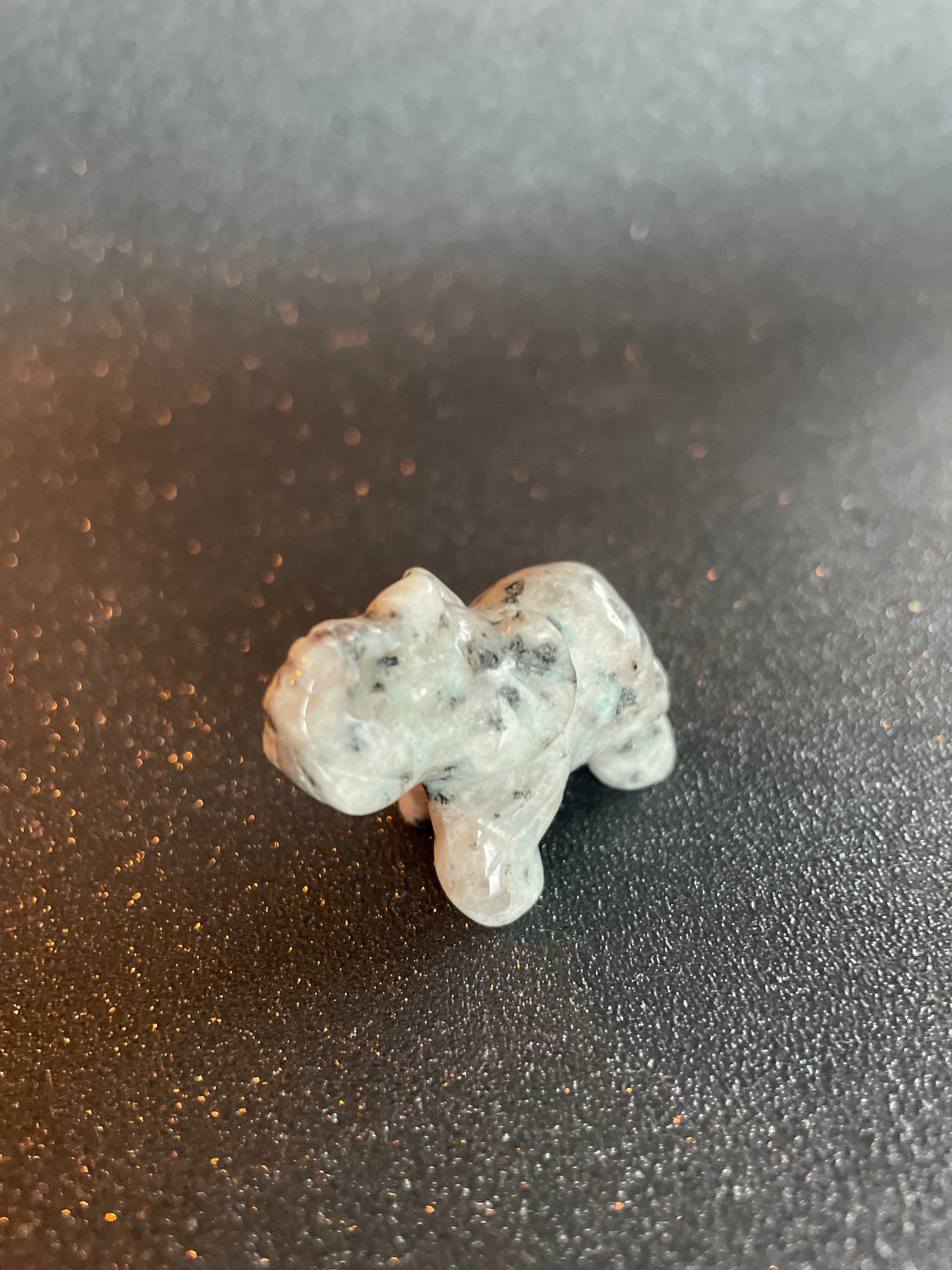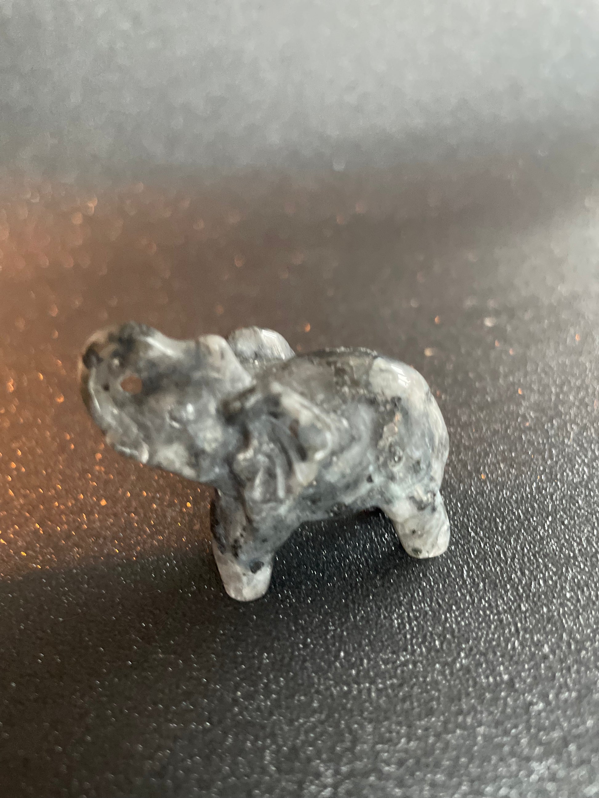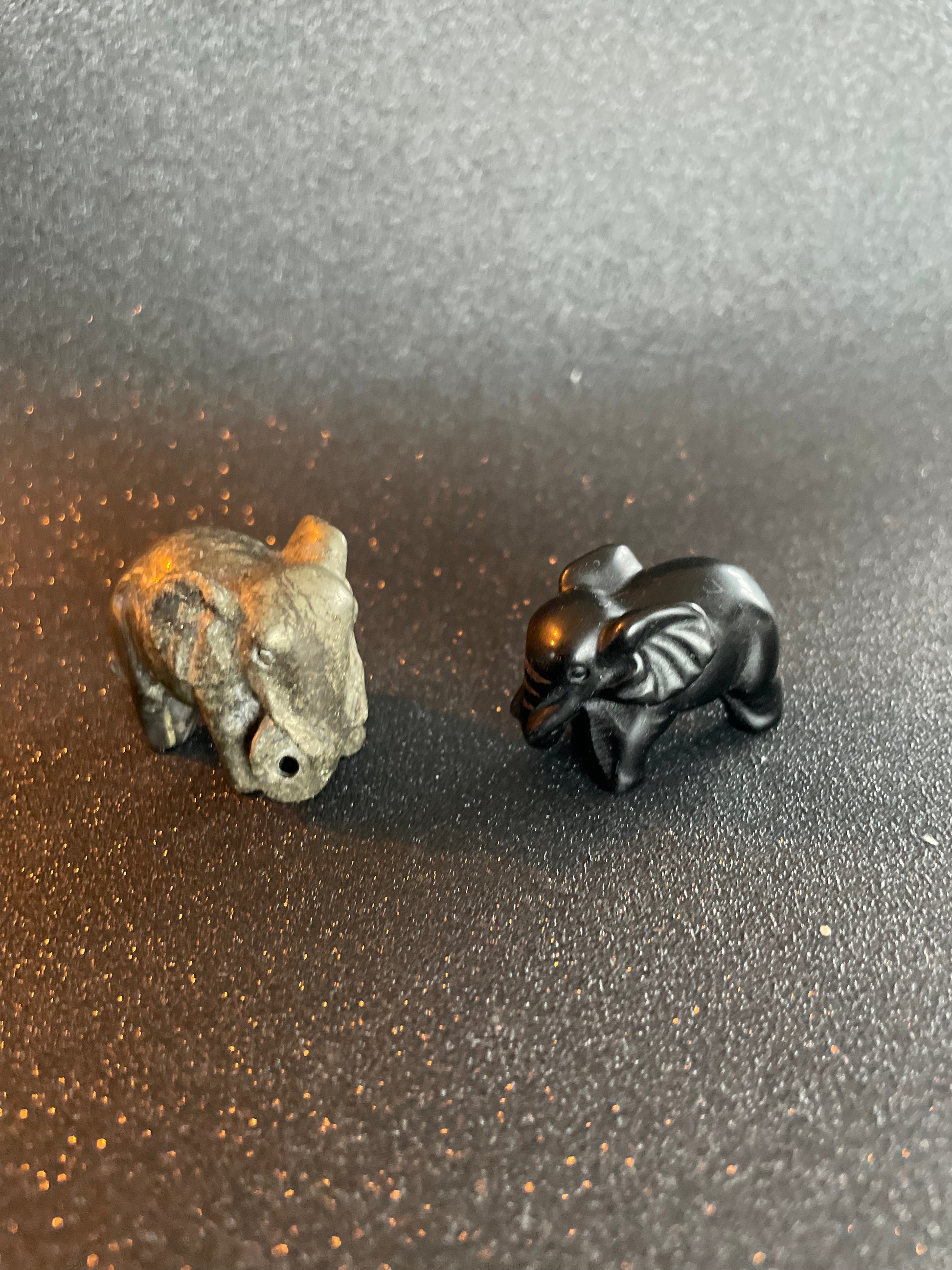 Diverse olifanten carvings. De olifanten staan gesorteerd per steensoort met bijpassende kleur.