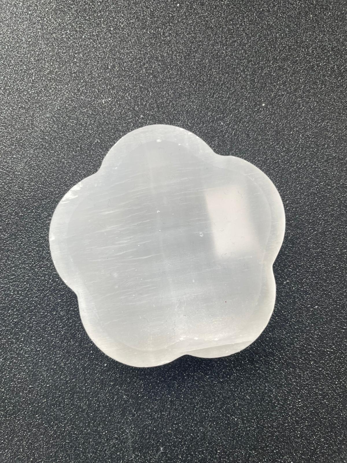 Een bloem van seleniet. Op deze bloem kan je heel goed andere stenen leggen, zodat deze kunnen opladen. De bloem heeft een doorsnede van 6,5cm.