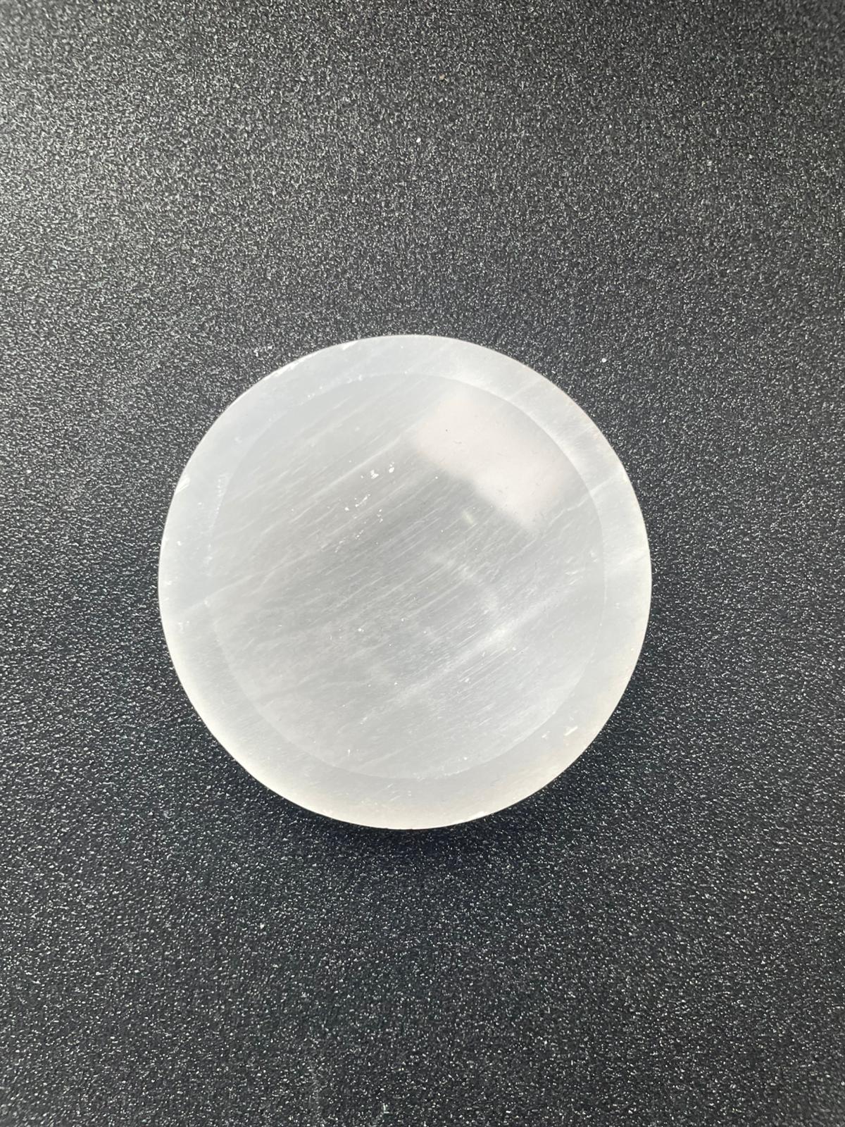 Een schijf van seleniet met een diameter van 6cm. Deze schijf is erg geschikt om je andere edelstenen op te leggen, zodat deze kunnen opladen.