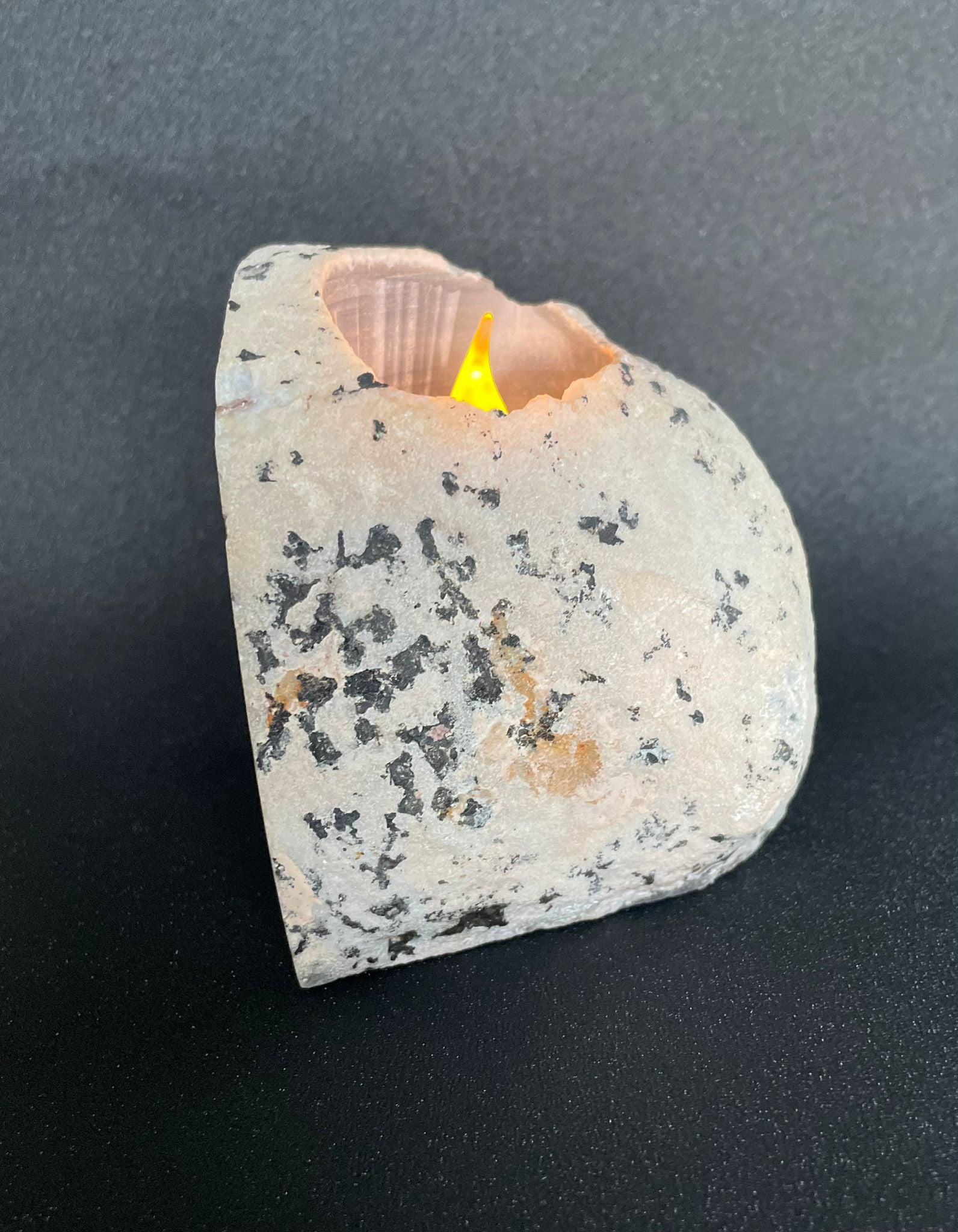 Een mooie theelichthouder van agaat. Deze theelichthouder is 10cm hoog en weegt 685 gram.